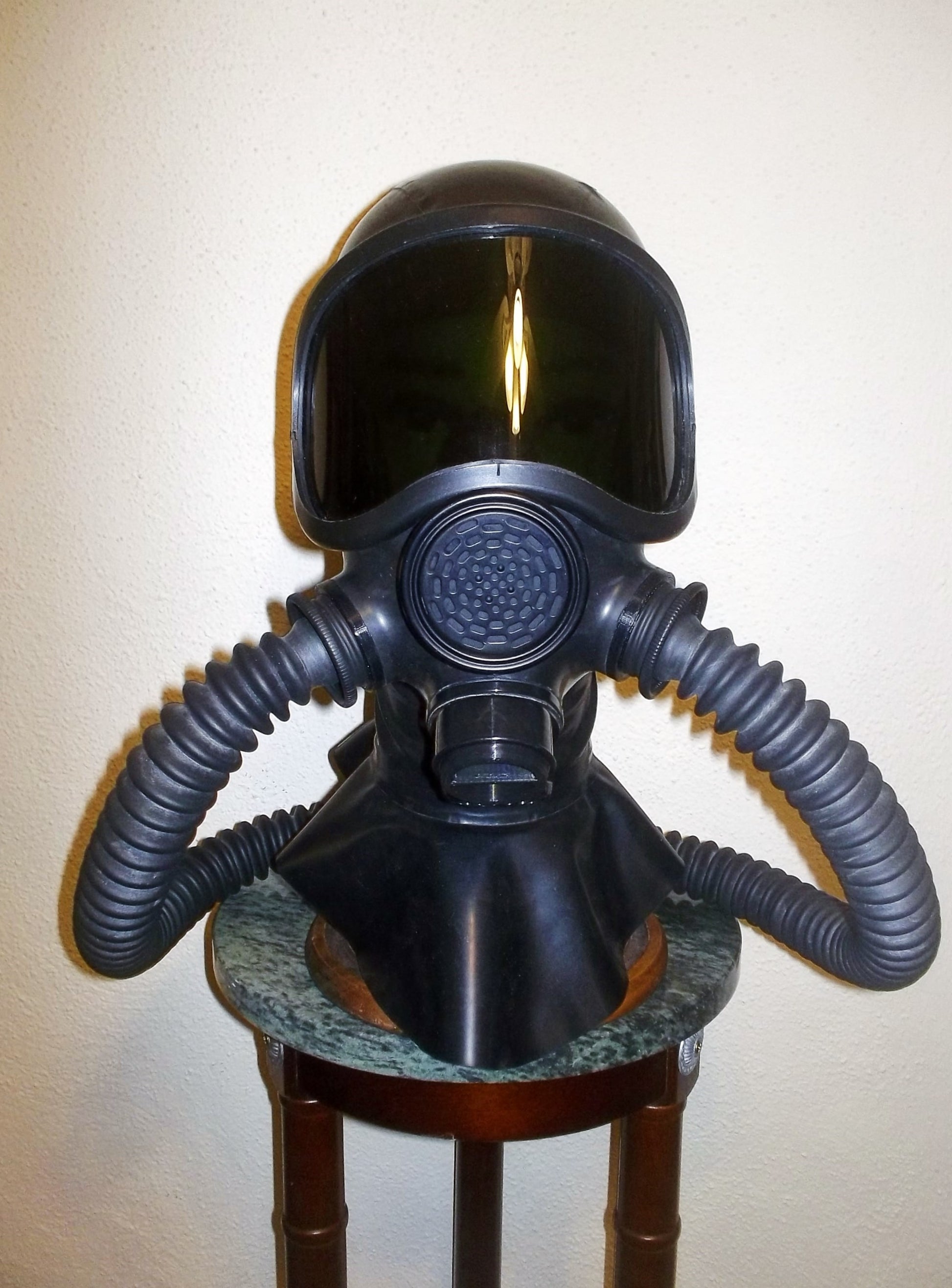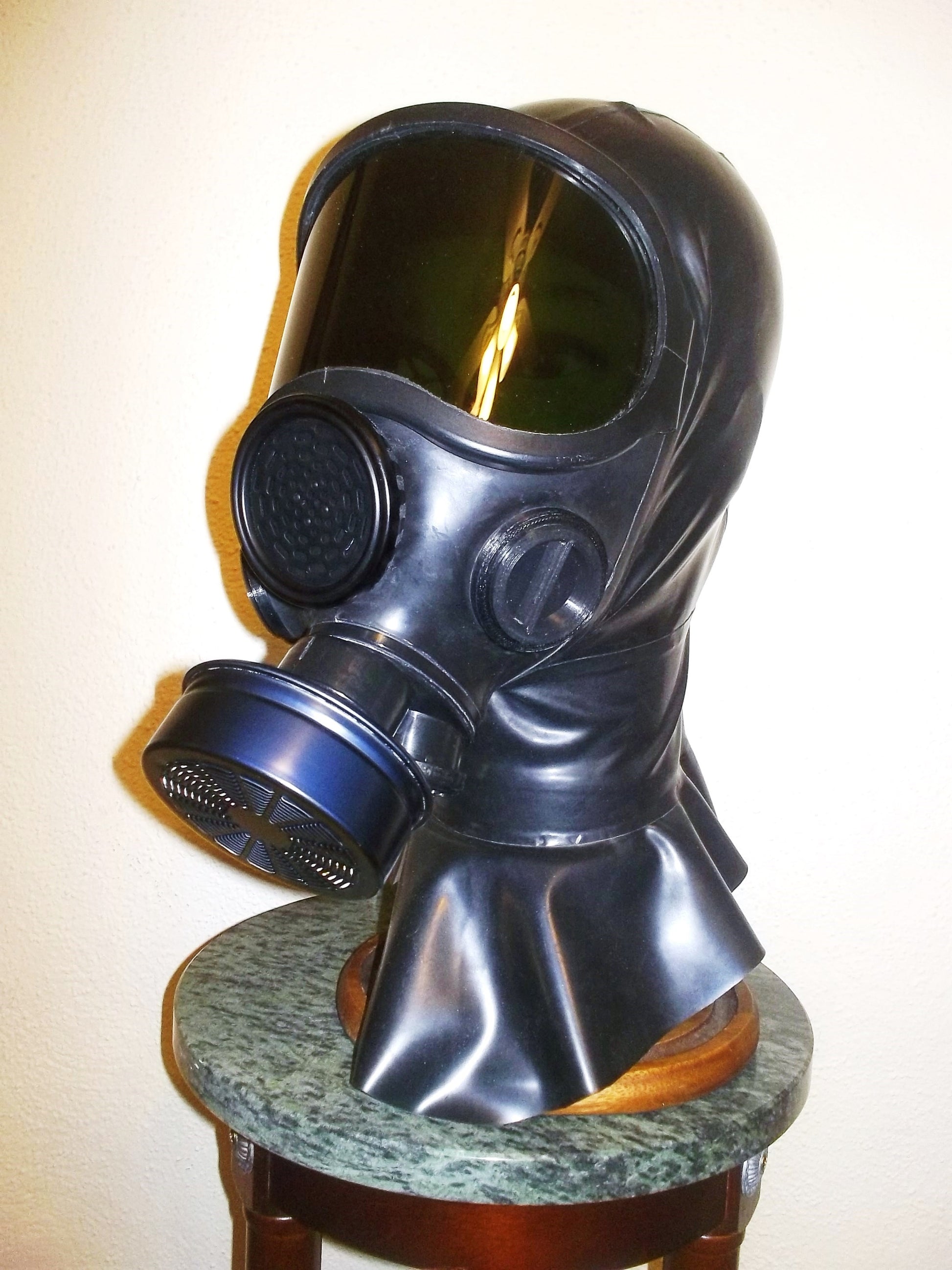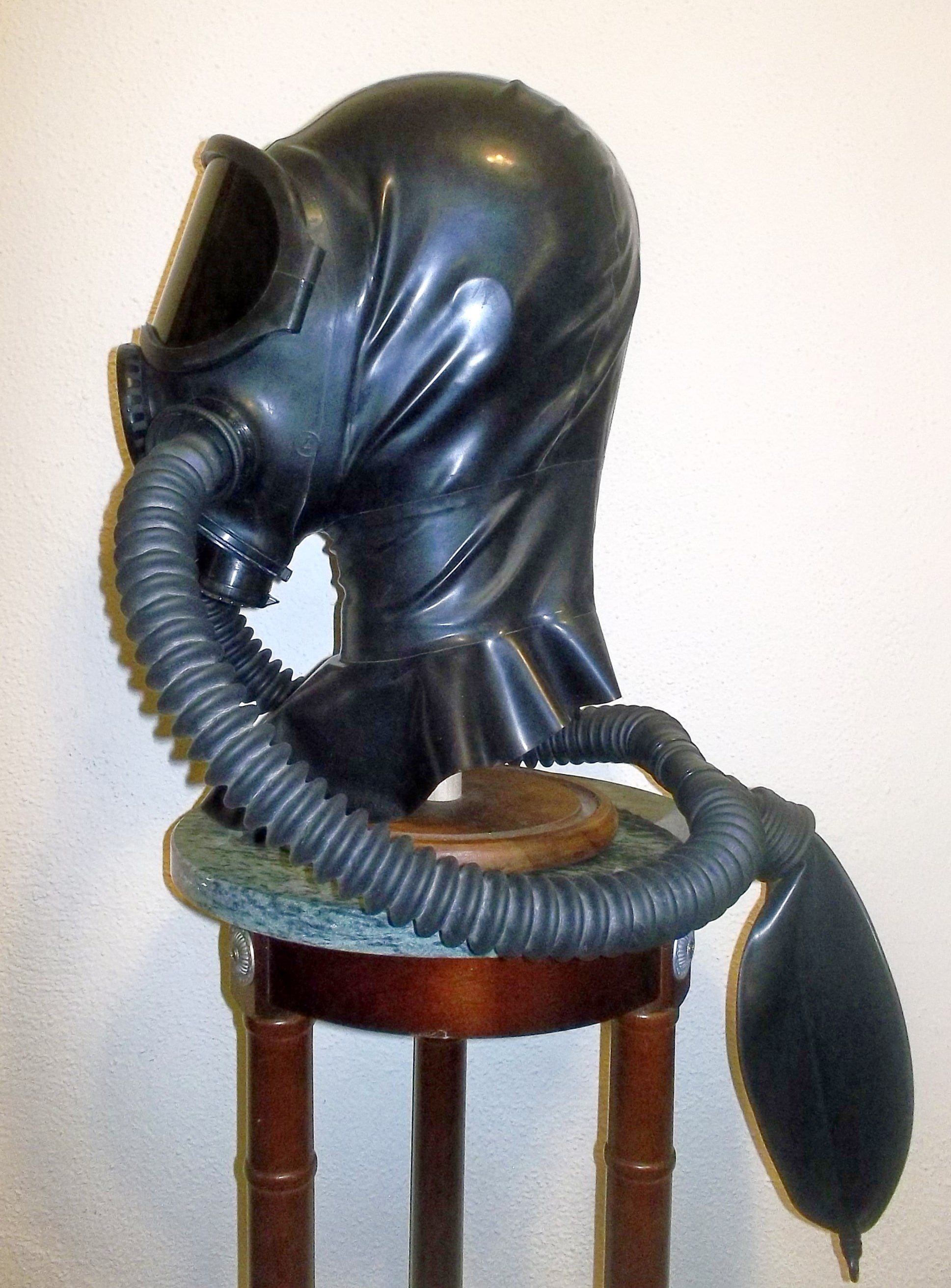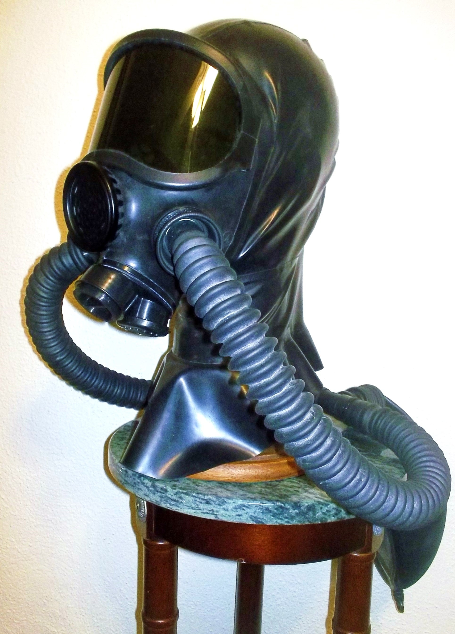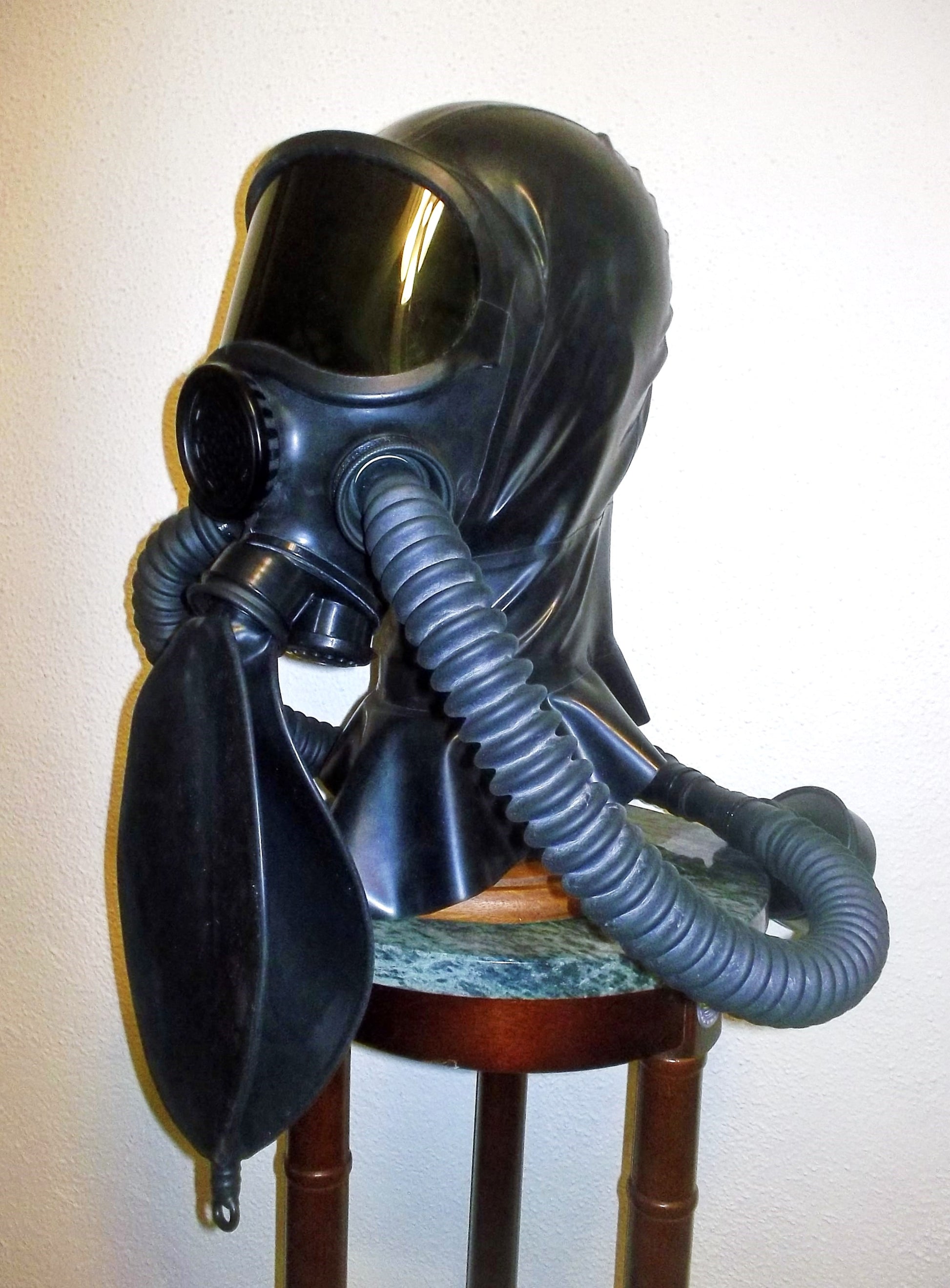Custom HEAVY RUBBER Fetish LATEX Hooded GAS MASK with 3 Inlet PORTS, Dark Lens Shield, Twin Hoses and Rebreather Bag by FANTOMAS & Co.