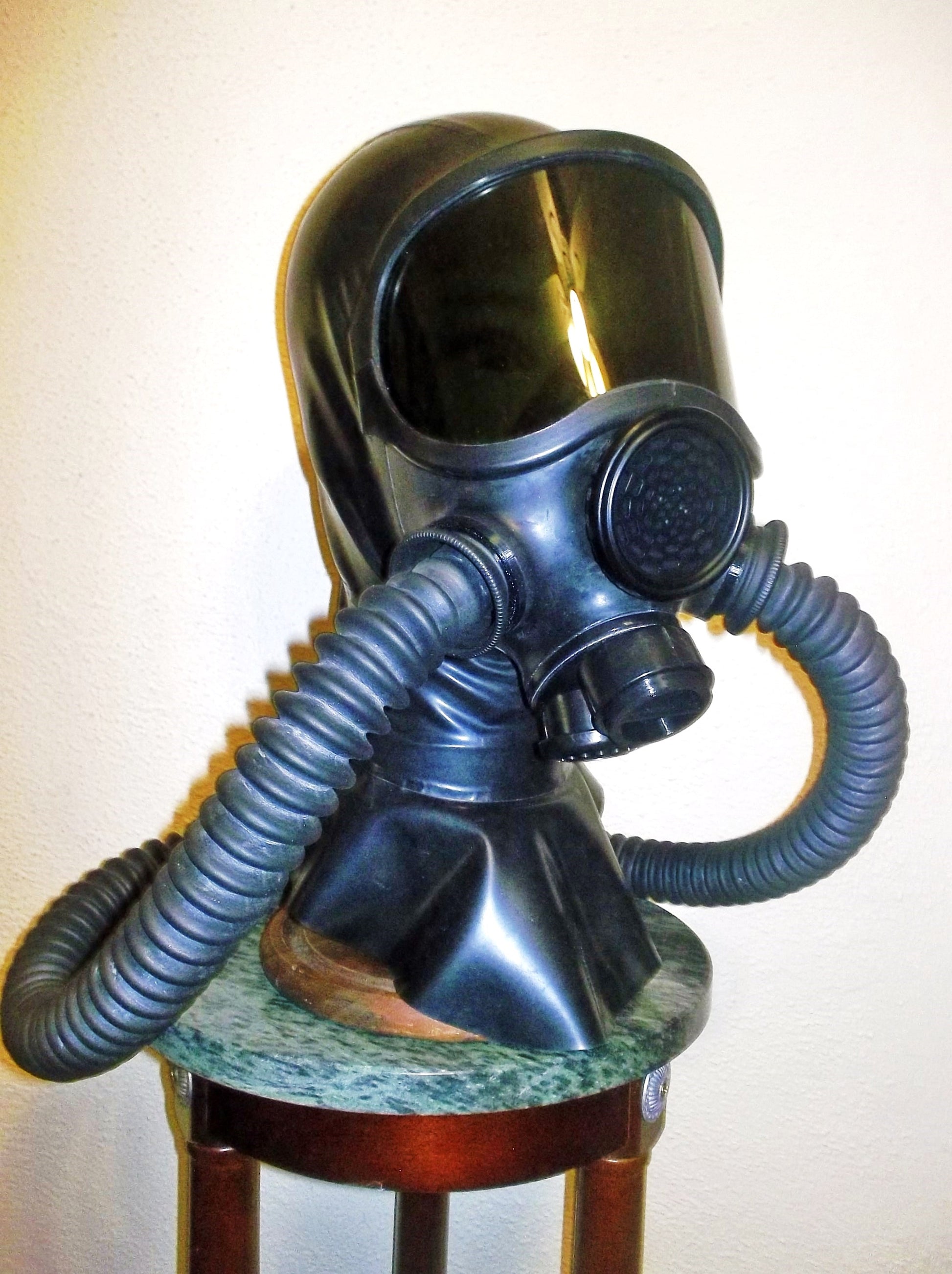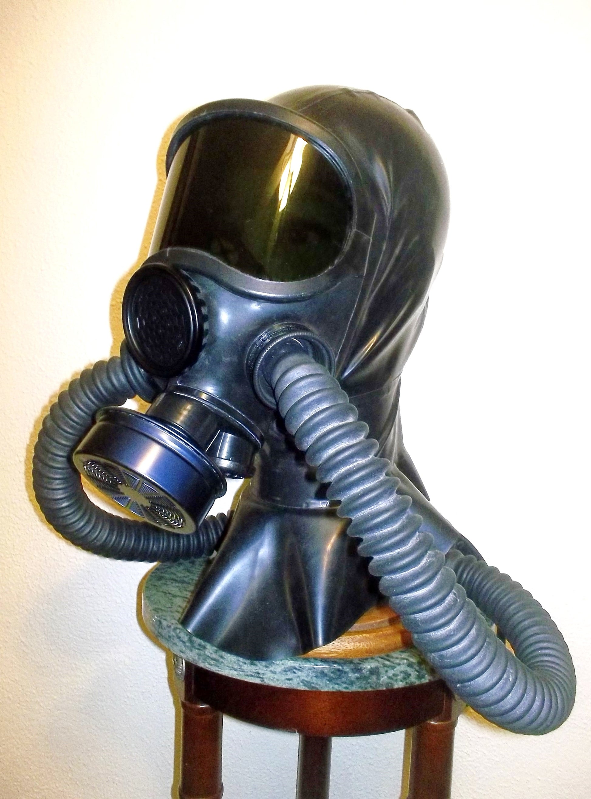 REBREATHER GAS MASK HOOD with 3 INLET PORTS, DARK TINTED FACESHIELD LENS and TWIN HOSES.
