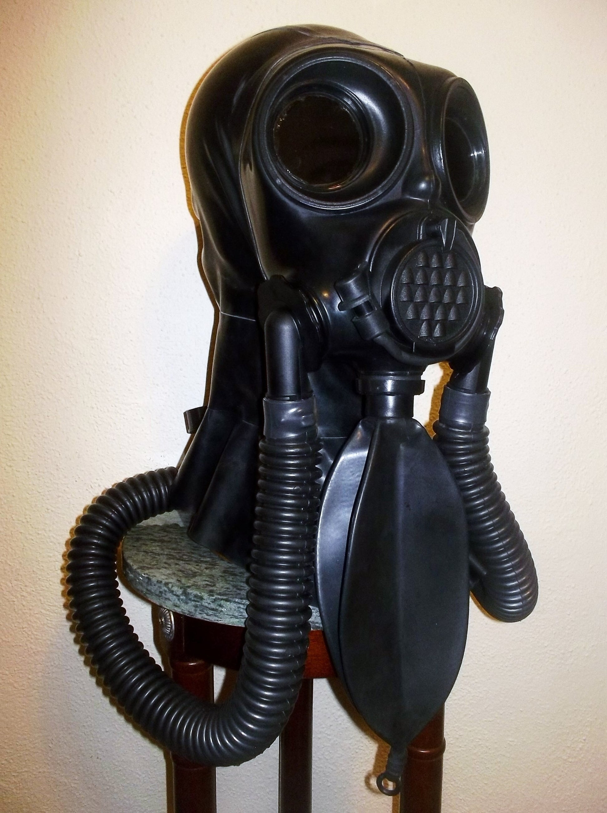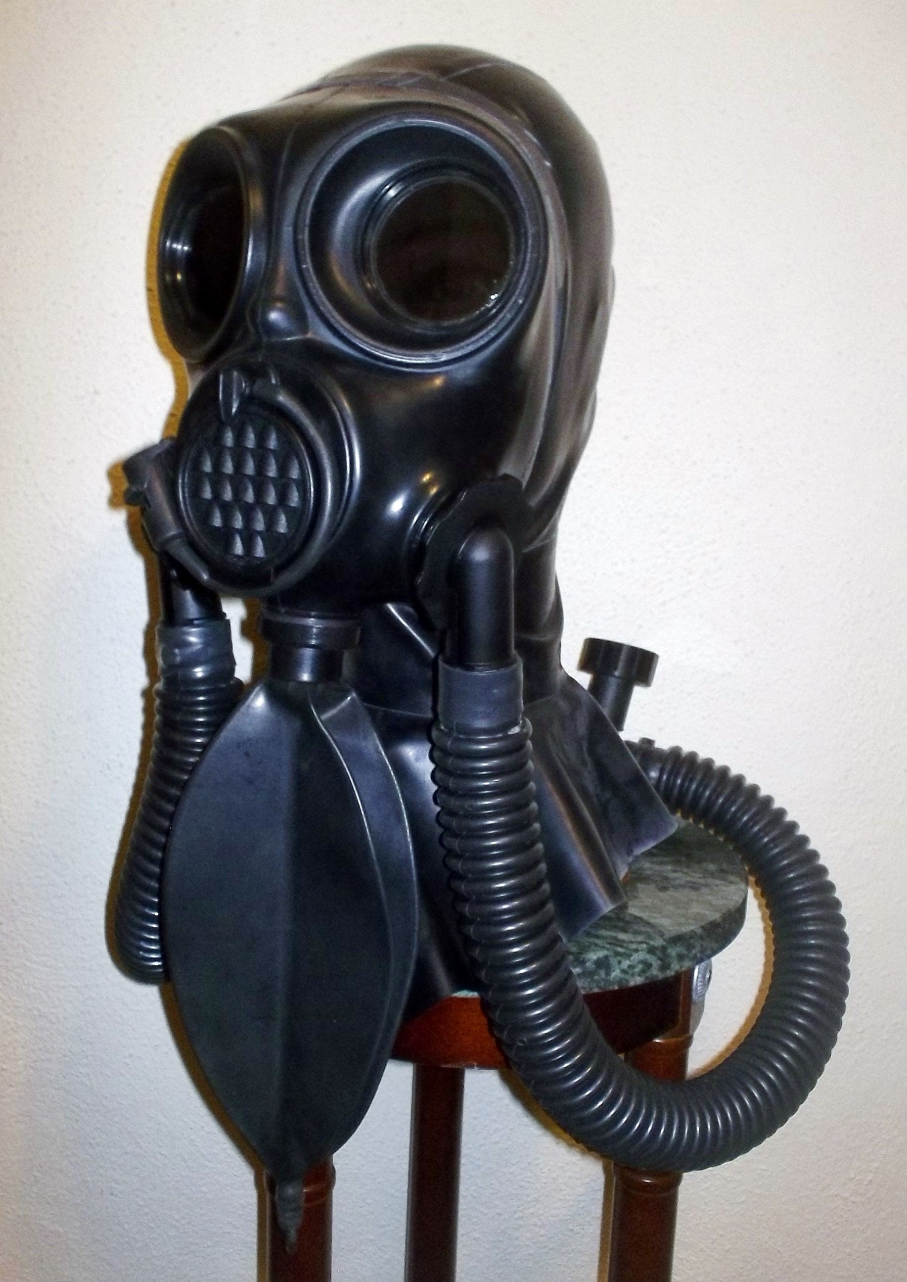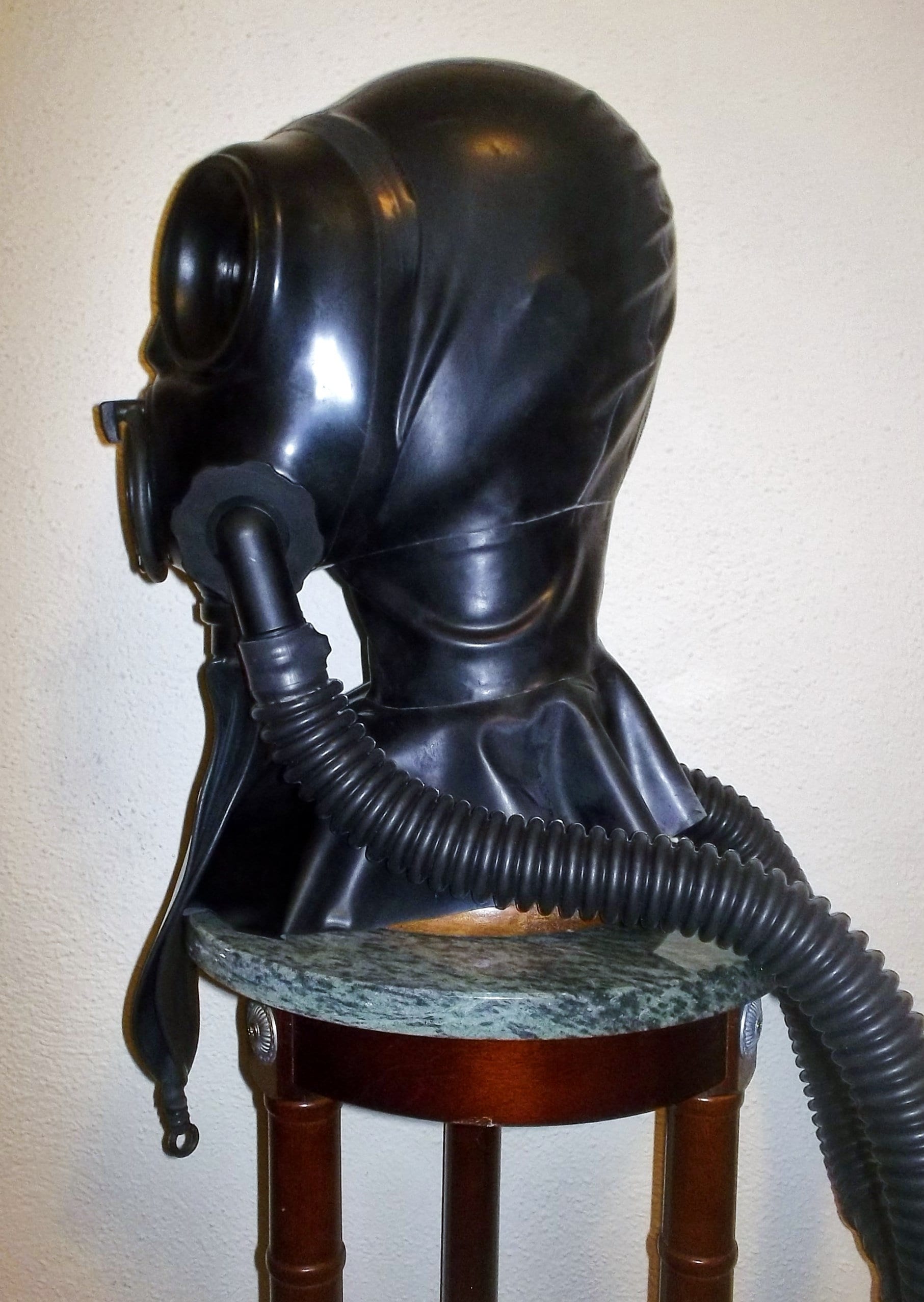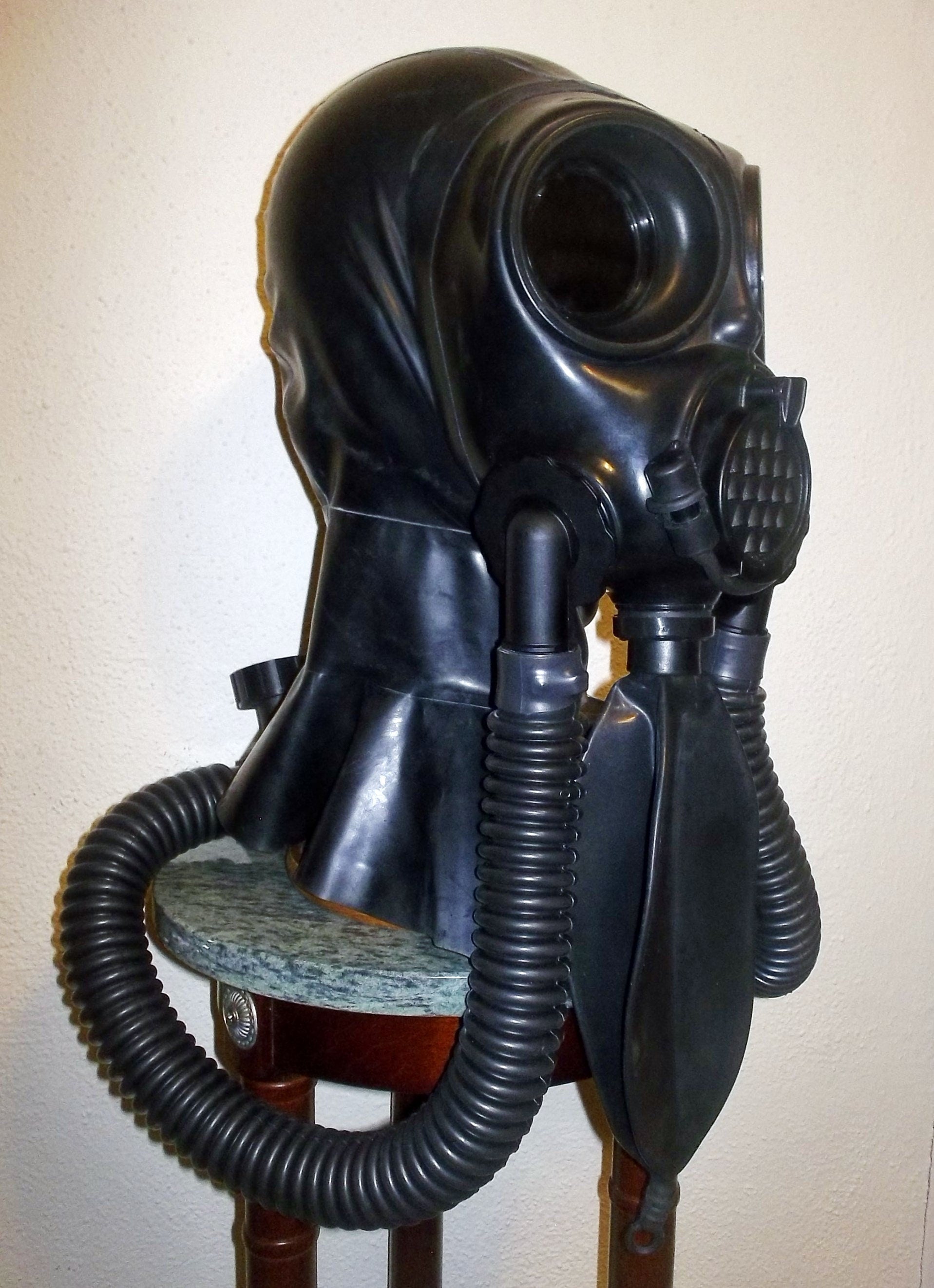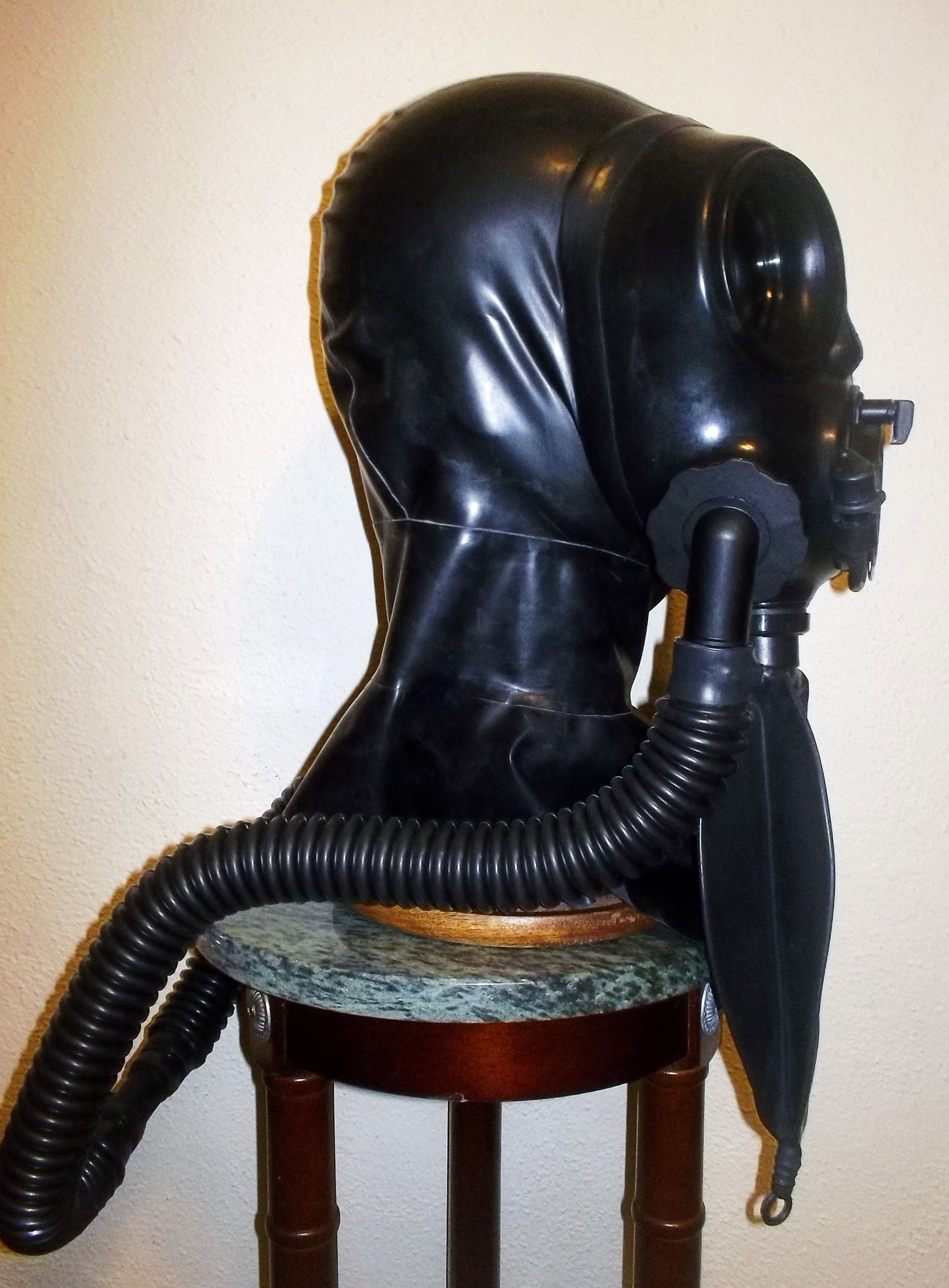 Fetish HEAVY RUBBER Gas Mask LATEX HOOD with Dark Lenses, Twin Hoses and Rebreather Bag by FANTOMAS & Co.