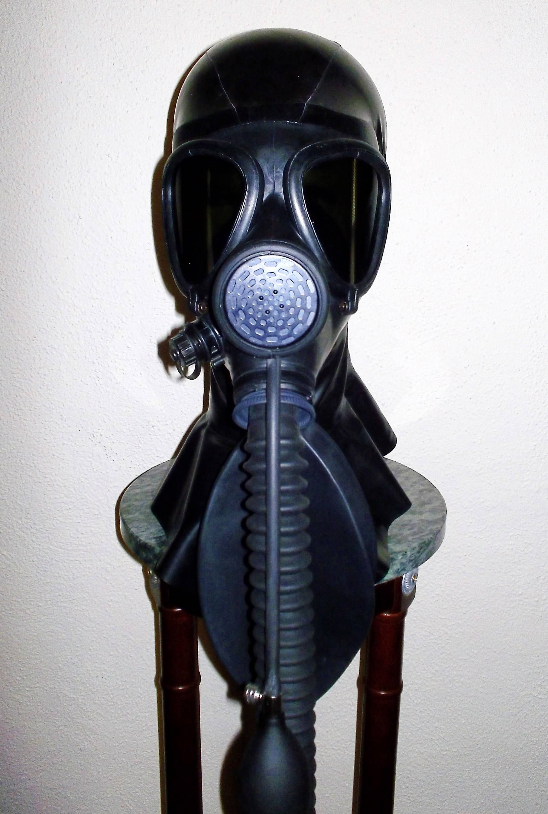 - ~SMOOTH AND SUPPLE BLACK HEAVY RUBBER GAS MASK with INTEGRATED silky smooth BLACK LATEX HOOD that covers wearer's HEAD, NECK AND DRAPES OVER SHOULDERS for a comfortable fit and FULL ENCLOSURE (works great with rubber suits- NO NECK LINE!).