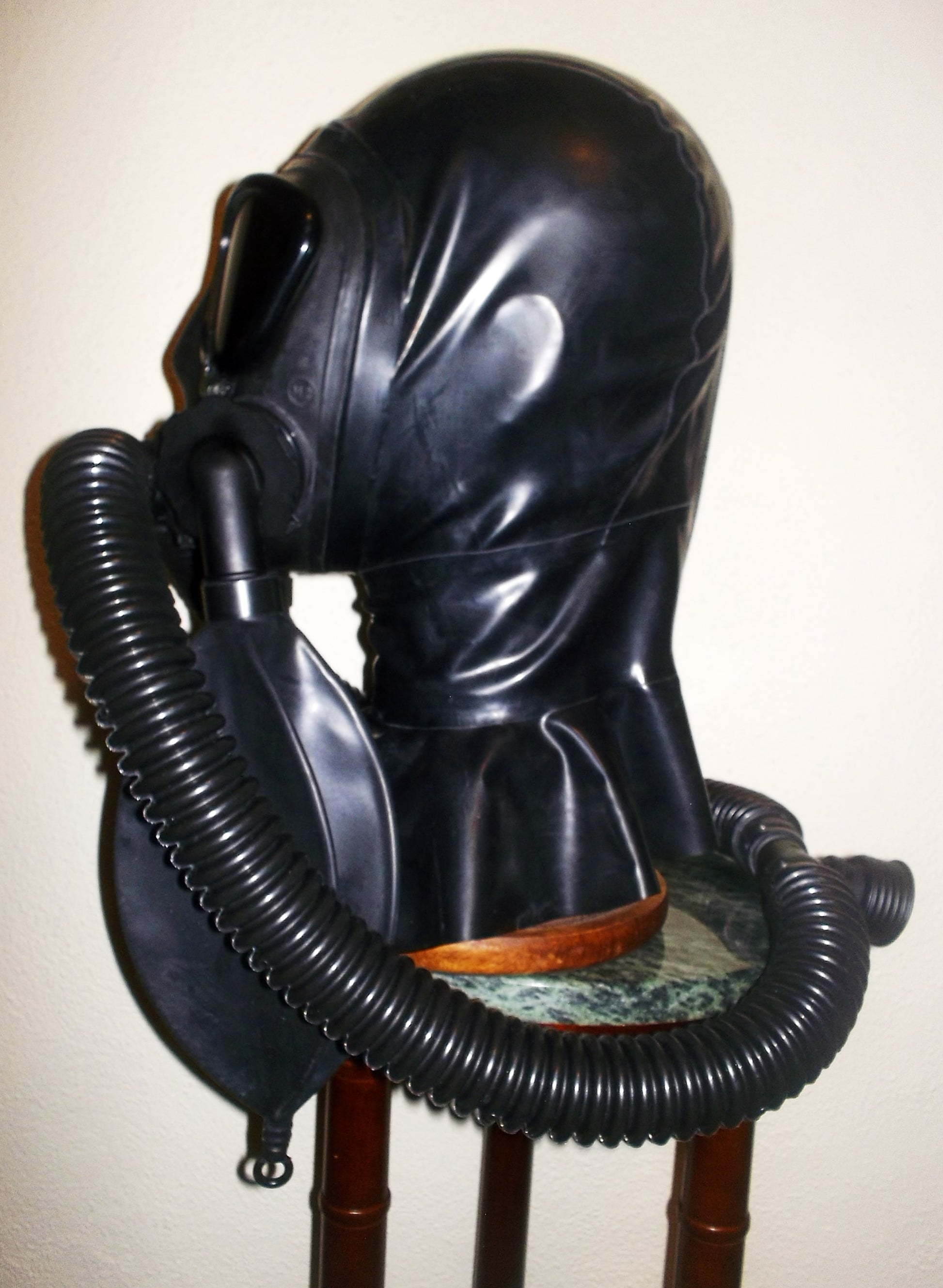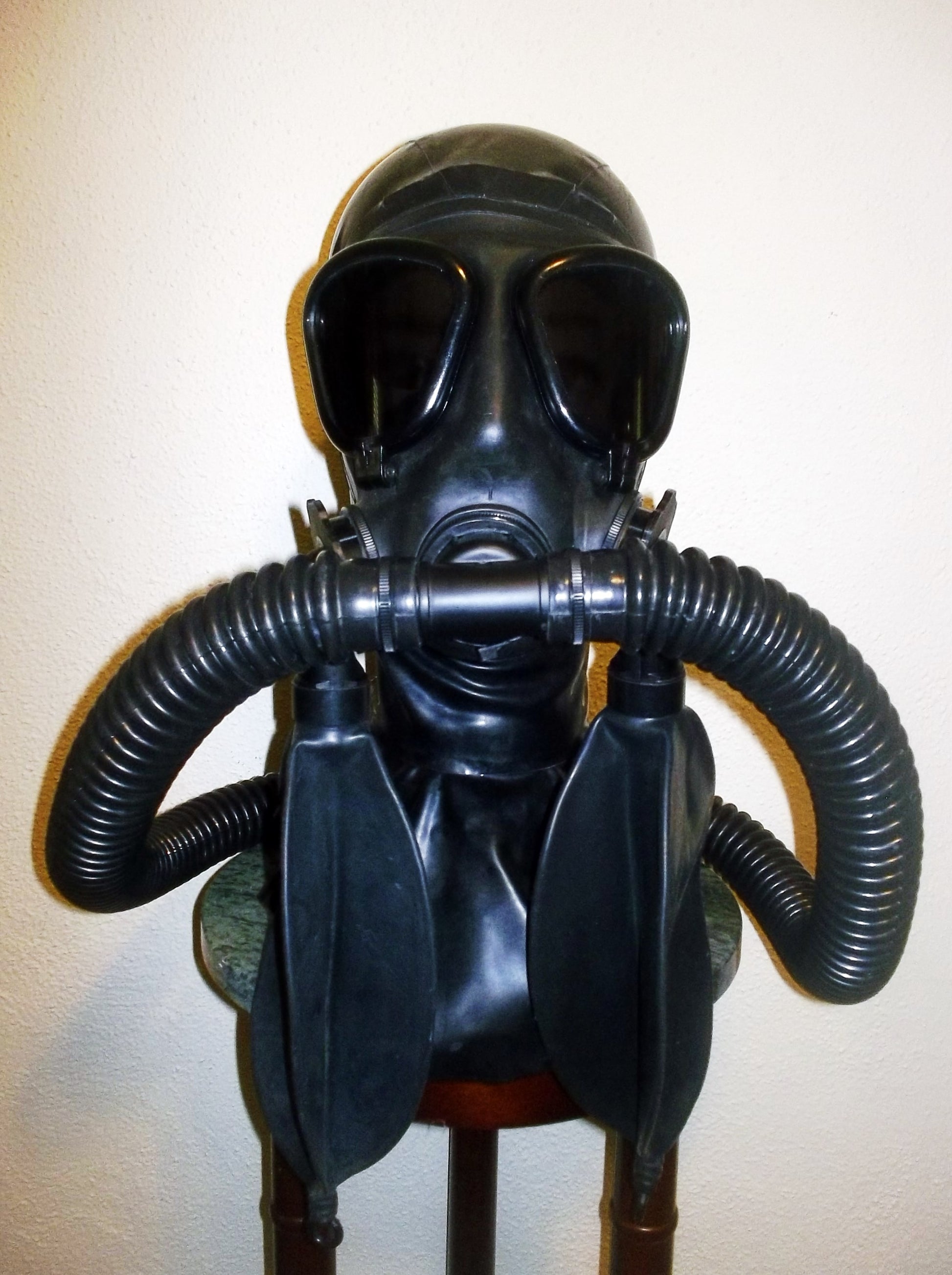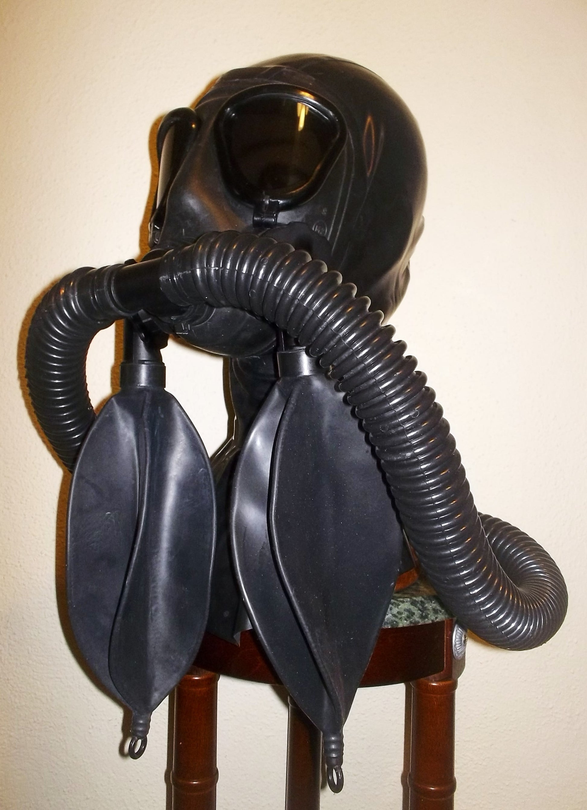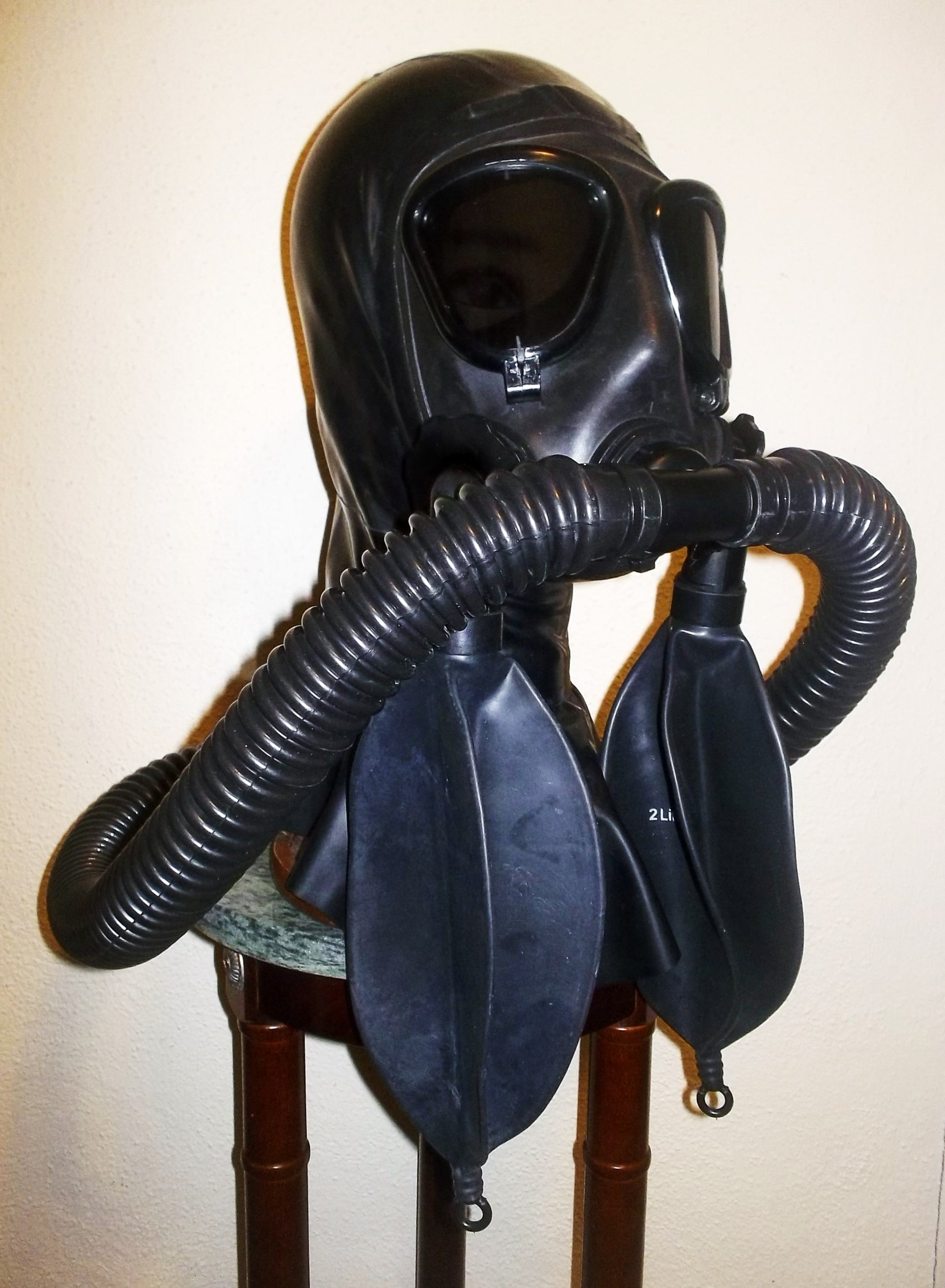 FETISH HEAVY RUBBER LATEX HOODED REBREATHER GAS MASK with TWO DETACHABLE REBREATHING BAGS and TWIN HOSES.