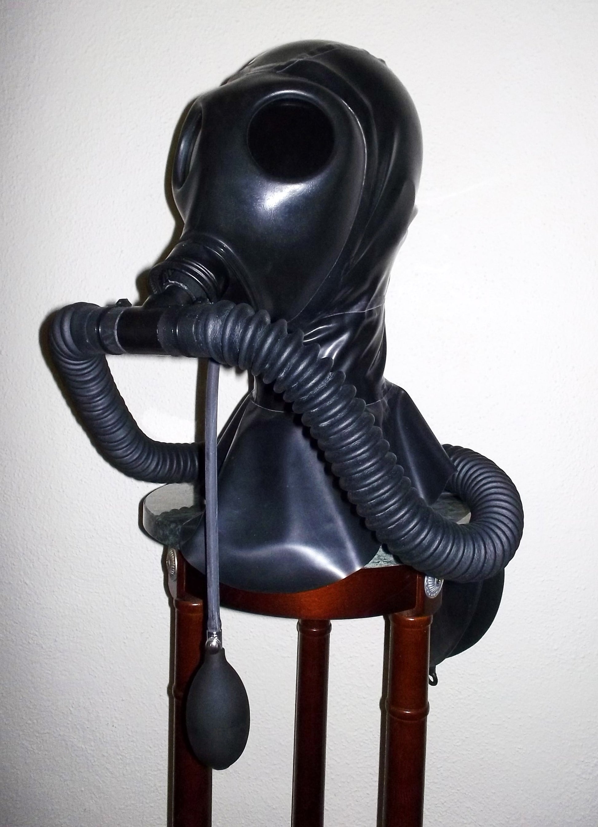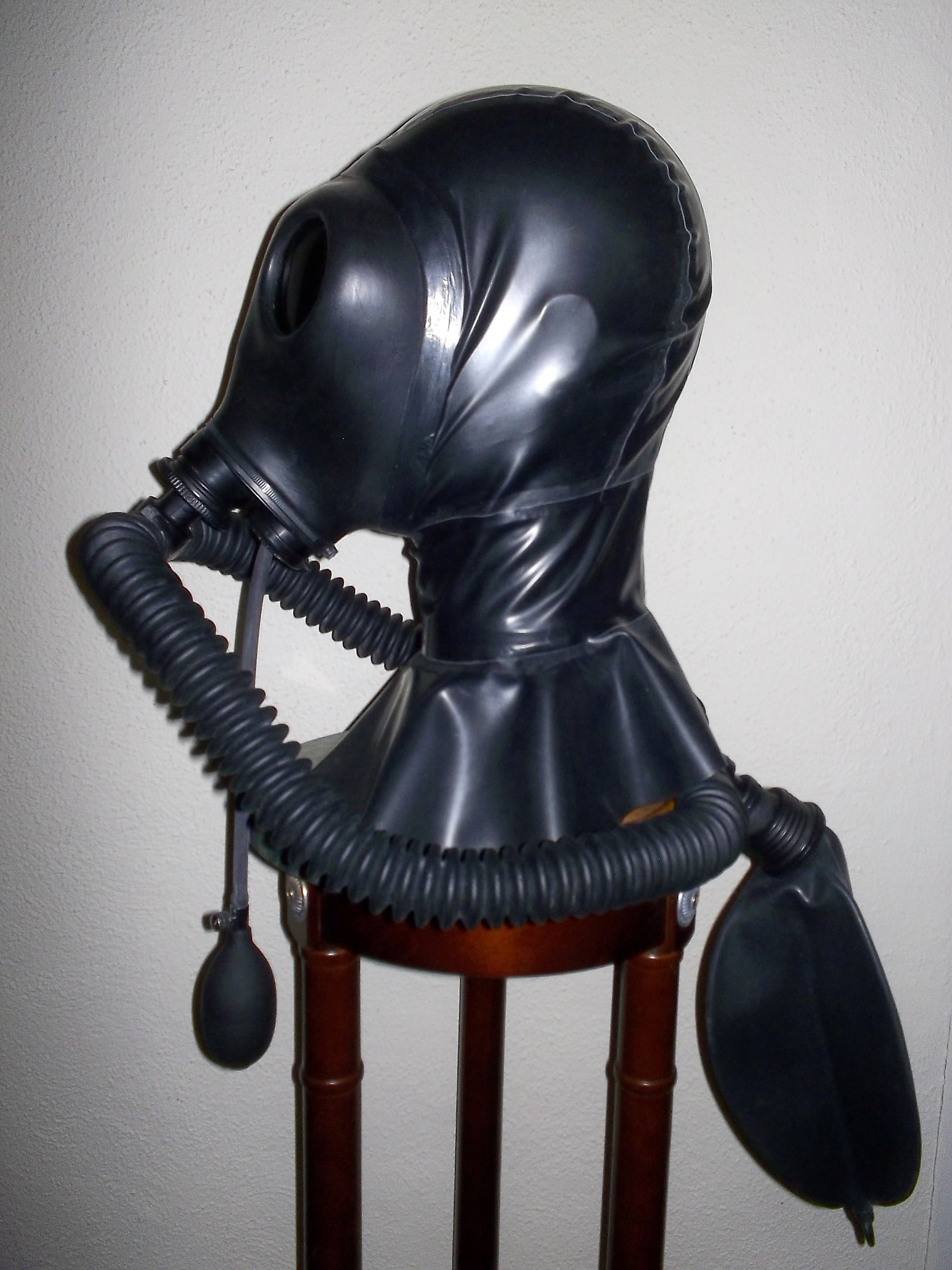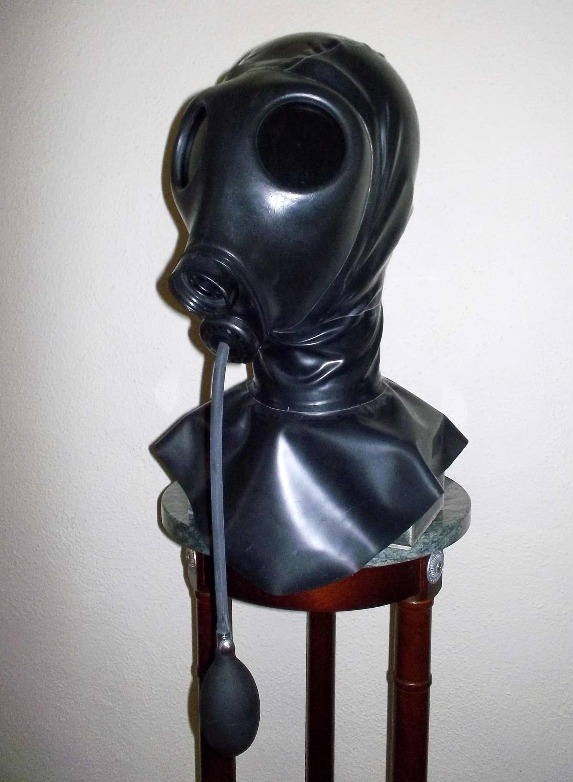 - HEAVY RUBBER BLACK GAS MASK with INTEGRATED silky smooth BLACK LATEX HOOD that COVERS WEARER'S HEAD, NECK AND DRAPES OVER THE SHOULDERS for comfortable fit and FULL ENCLOSURE (works great with rubber suits-no visible neckline!).