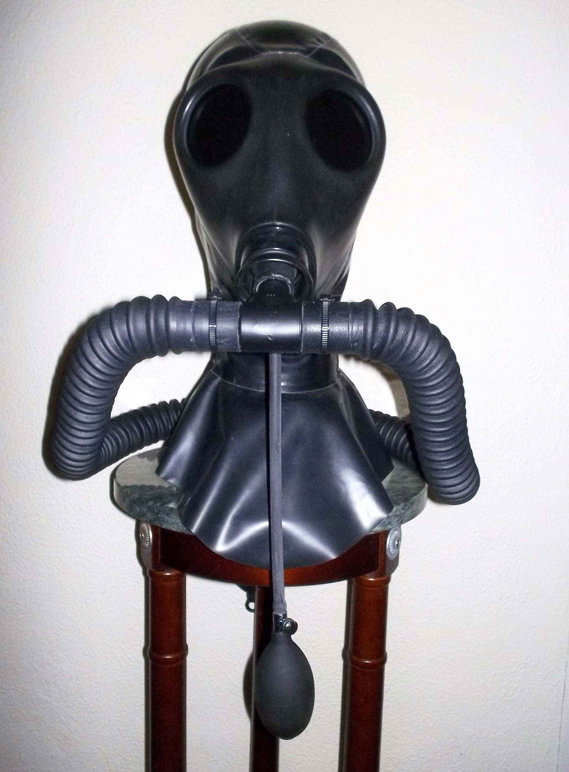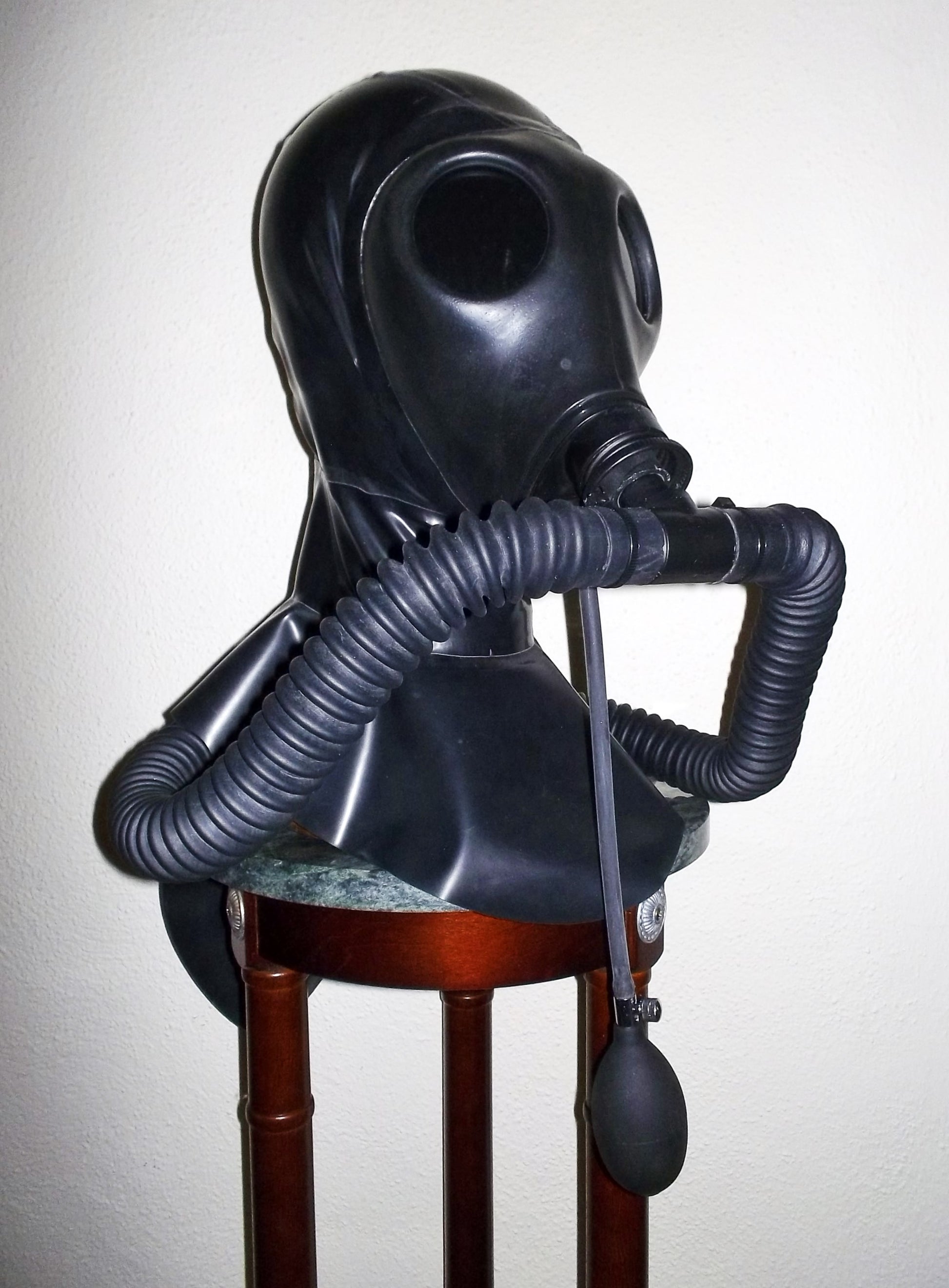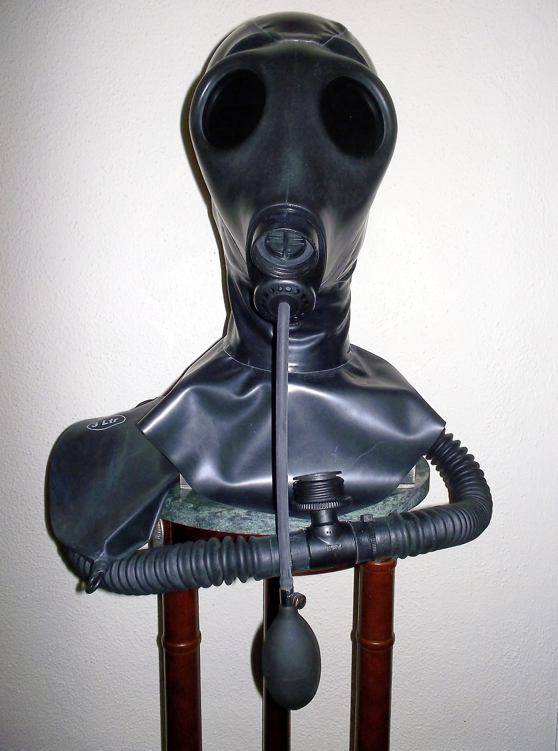 - HEAVY RUBBER BLACK GAS MASK with INTEGRATED silky smooth BLACK LATEX HOOD that COVERS WEARER'S HEAD, NECK AND DRAPES OVER THE SHOULDERS for comfortable fit and FULL ENCLOSURE (works great with rubber suits-no visible neckline!).