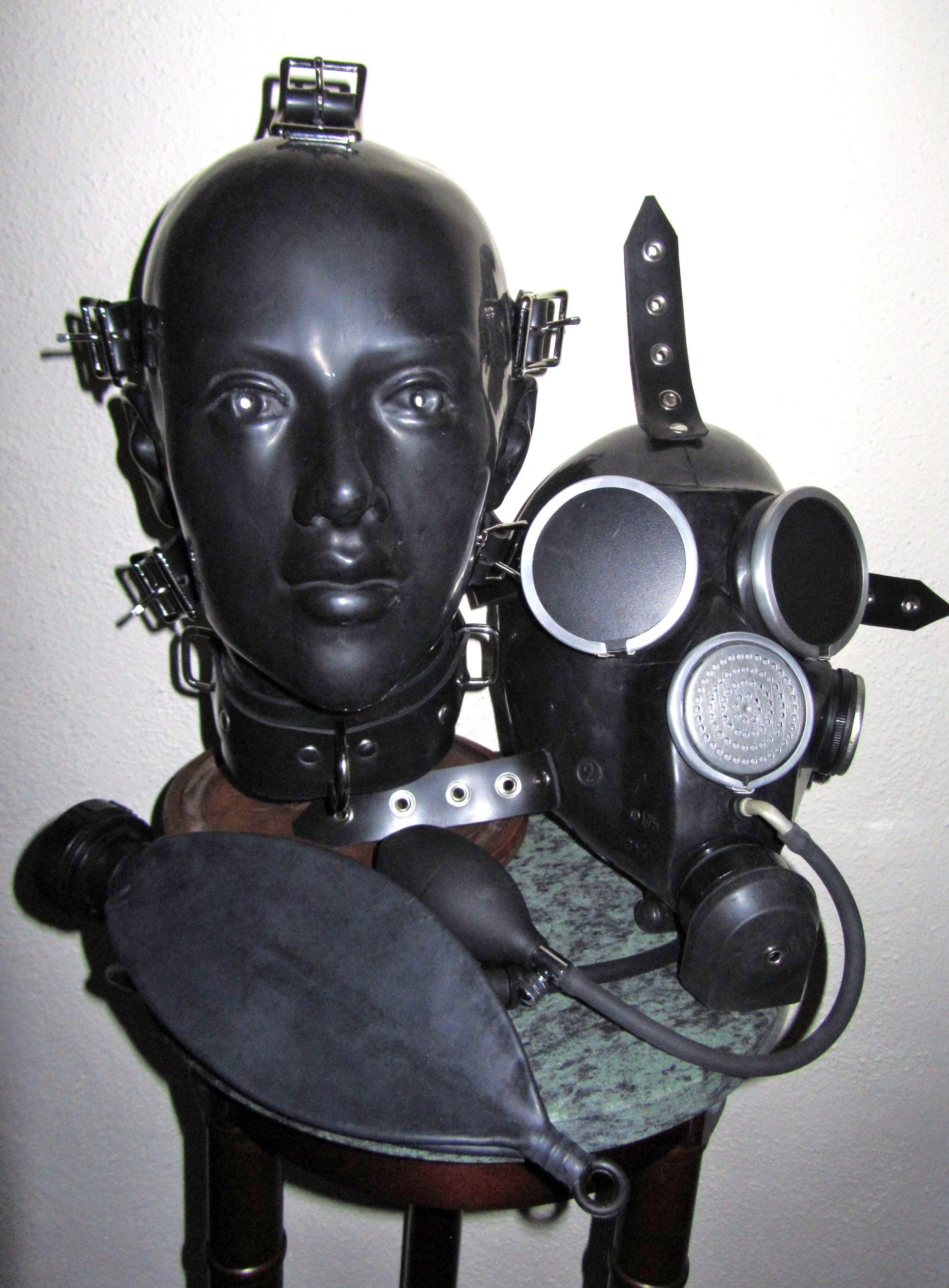 - HEAVY RUBBER FULL ENCLOSURE ANATOMICAL HELMET/MASK WITH ADJUSTABLE RIGID 'SLAVE' COLLAR.
