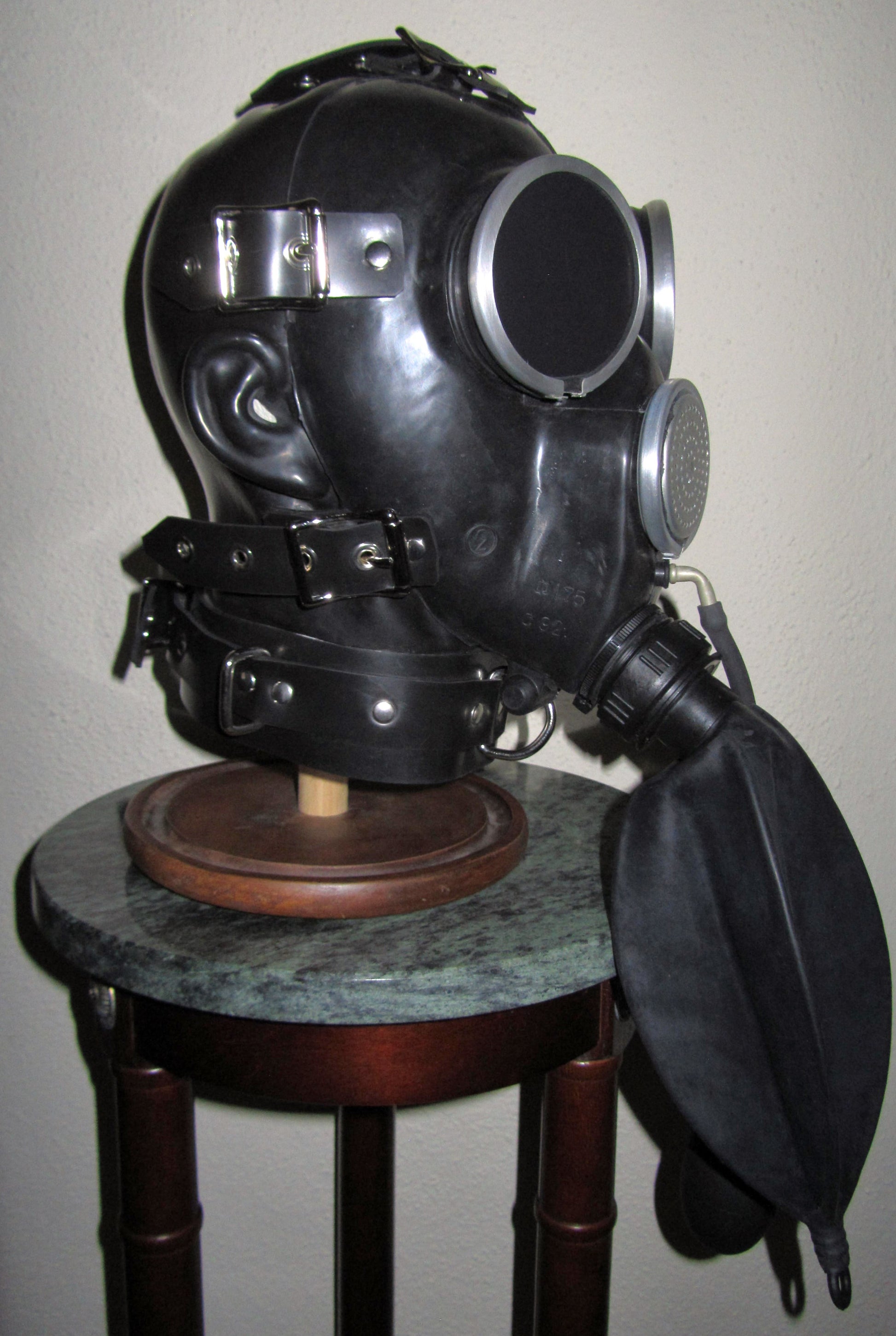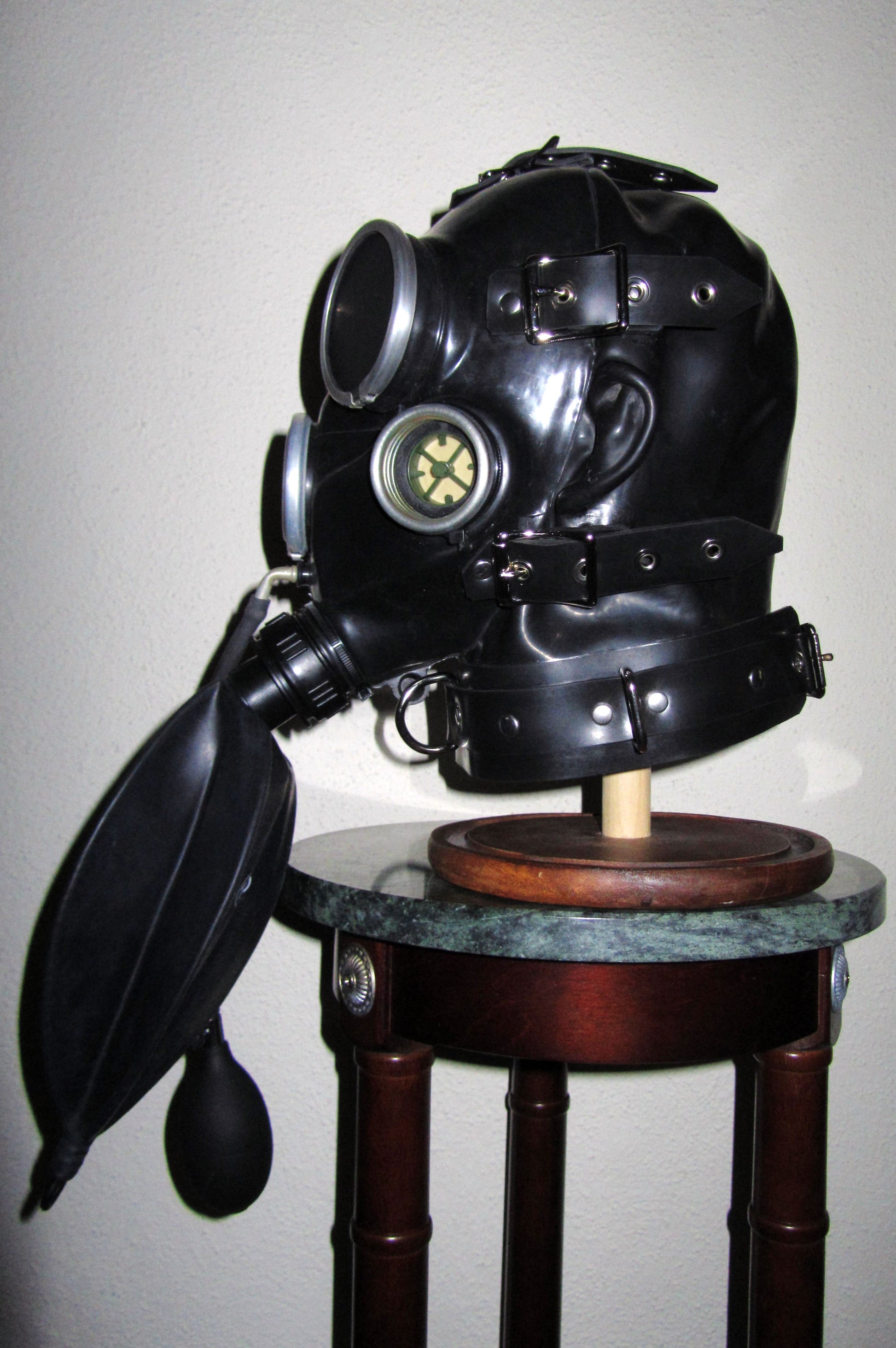 Fetish HEAVY RUBBER Anatomical LATEX HELMET / HOOD with RIGID COLLAR AND DETACHABLE ACCESSORIES: GAS MASK FACEPIECE, INFLATABLE MOUTH GAG with PUMP, REBREATHER BAG, DRINKING ATTACHMENT BLINDFOLD LENS COVERS.