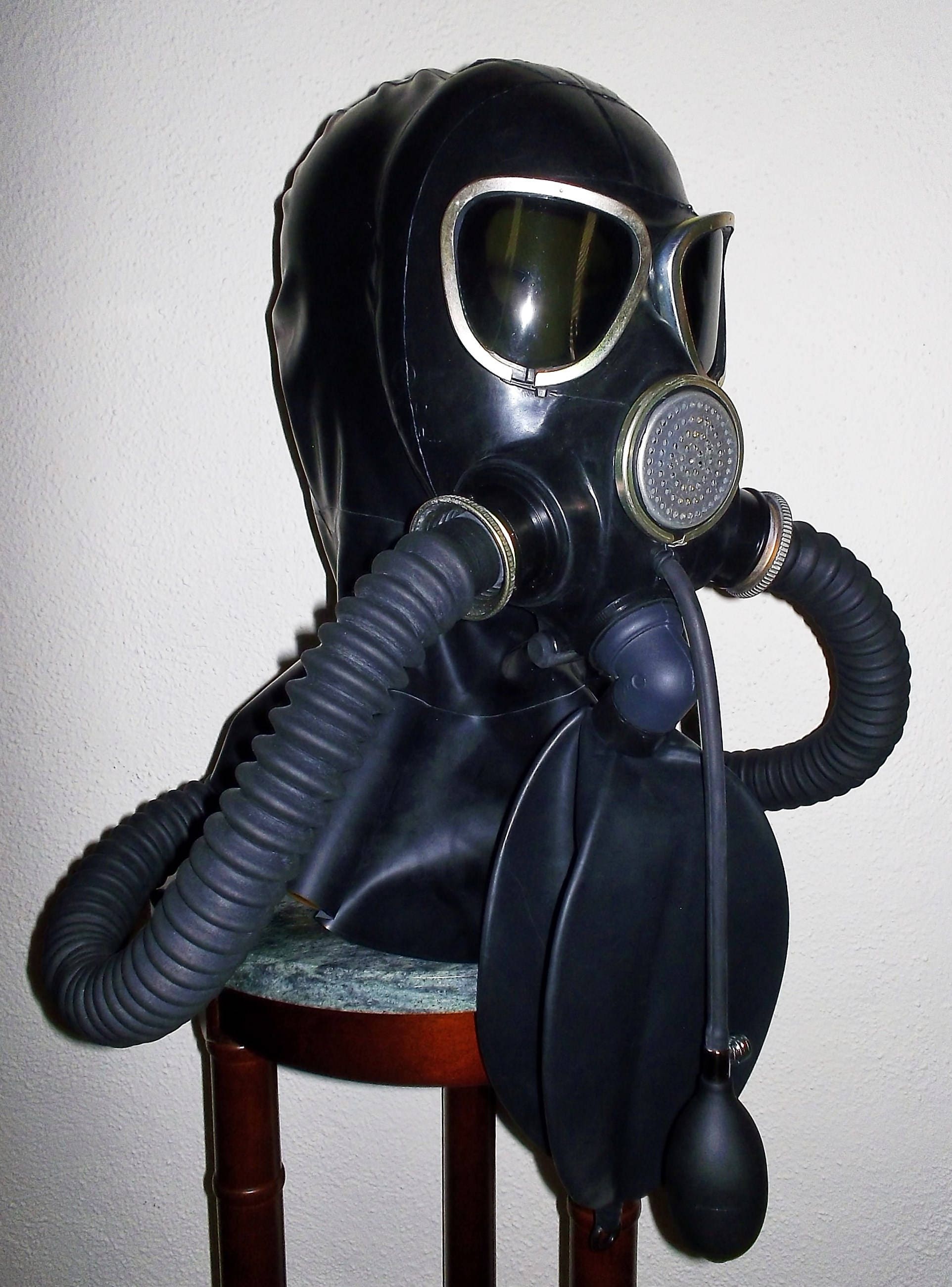 - HEAVY RUBBER BLACK GAS MASK with INTEGRATED silky smooth BLACK LATEX HOOD that COVERS WEARER'S HEAD, NECK AND DRAPES OVER THE SHOULDERS for comfortable fit and FULL ENCLOSURE (works great with rubber suits-no visible neckline!).