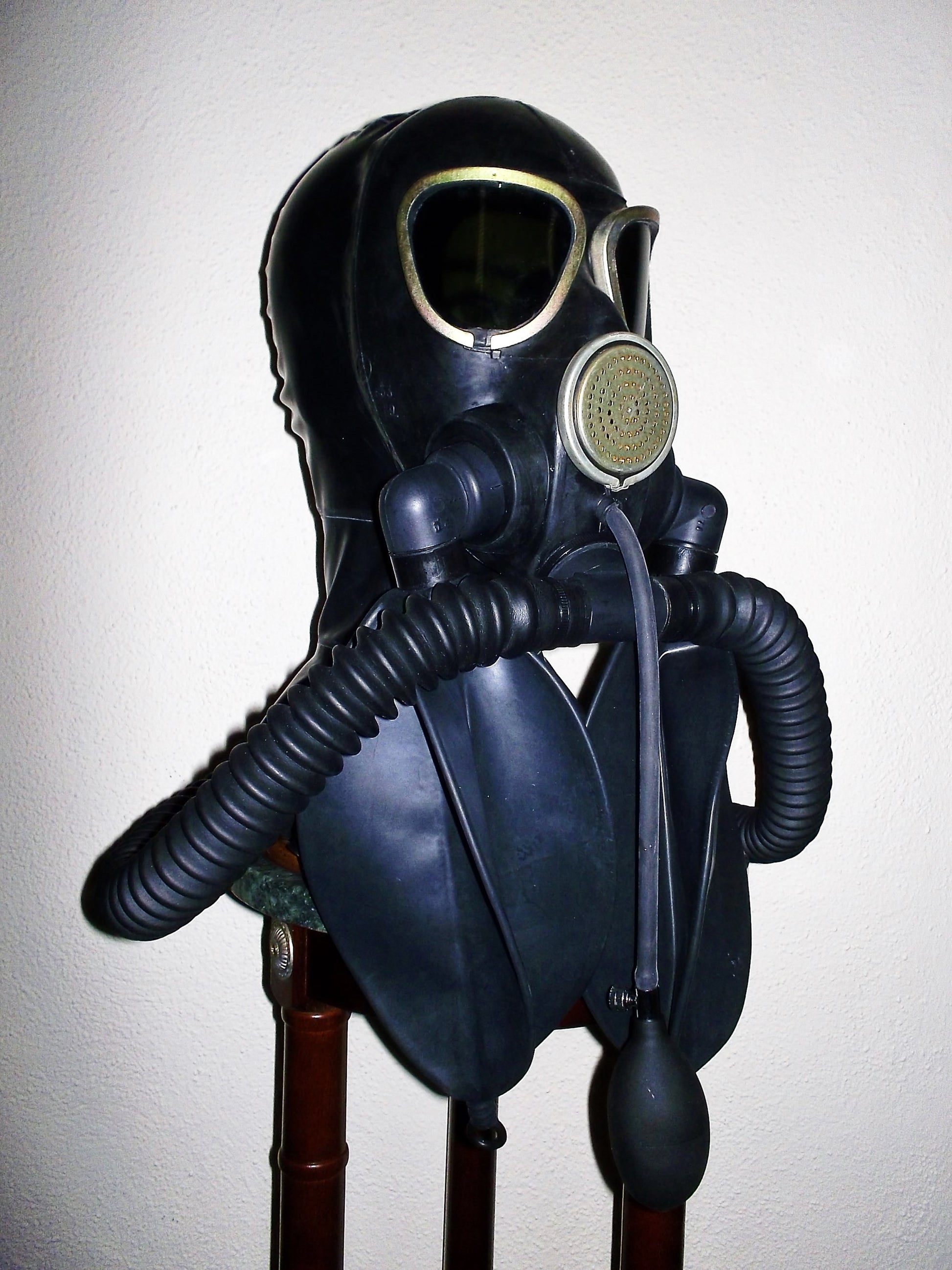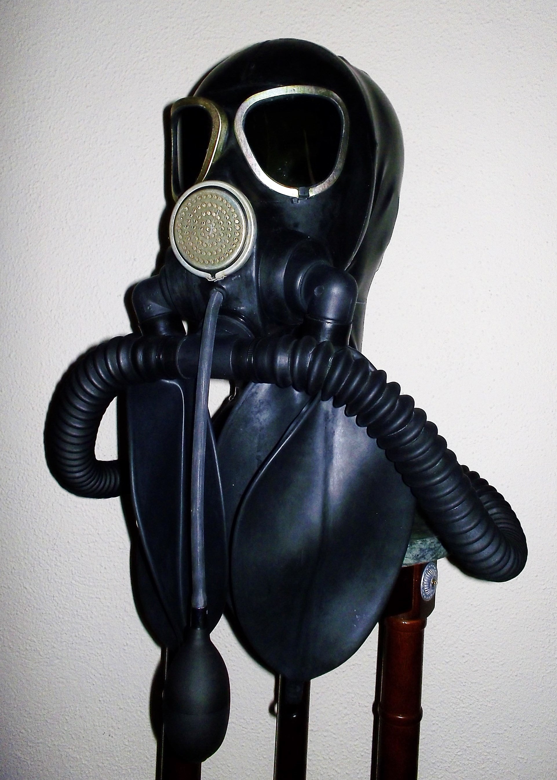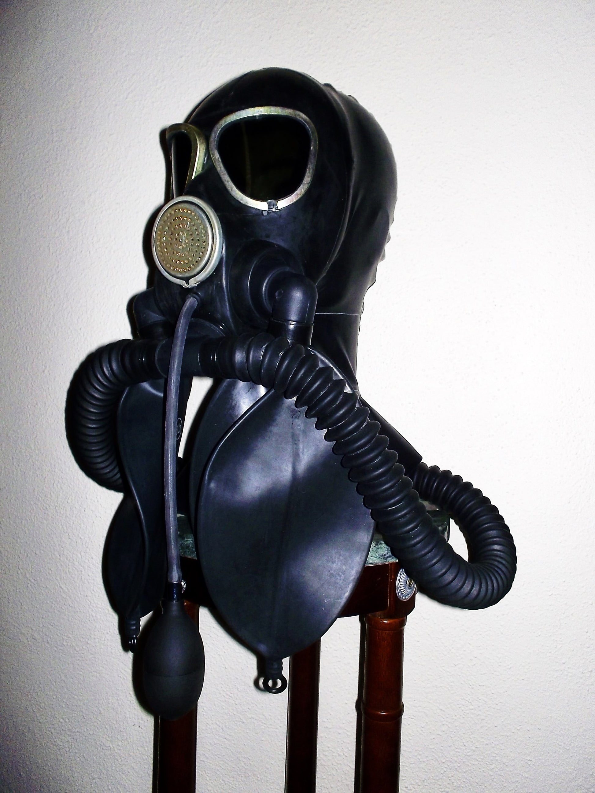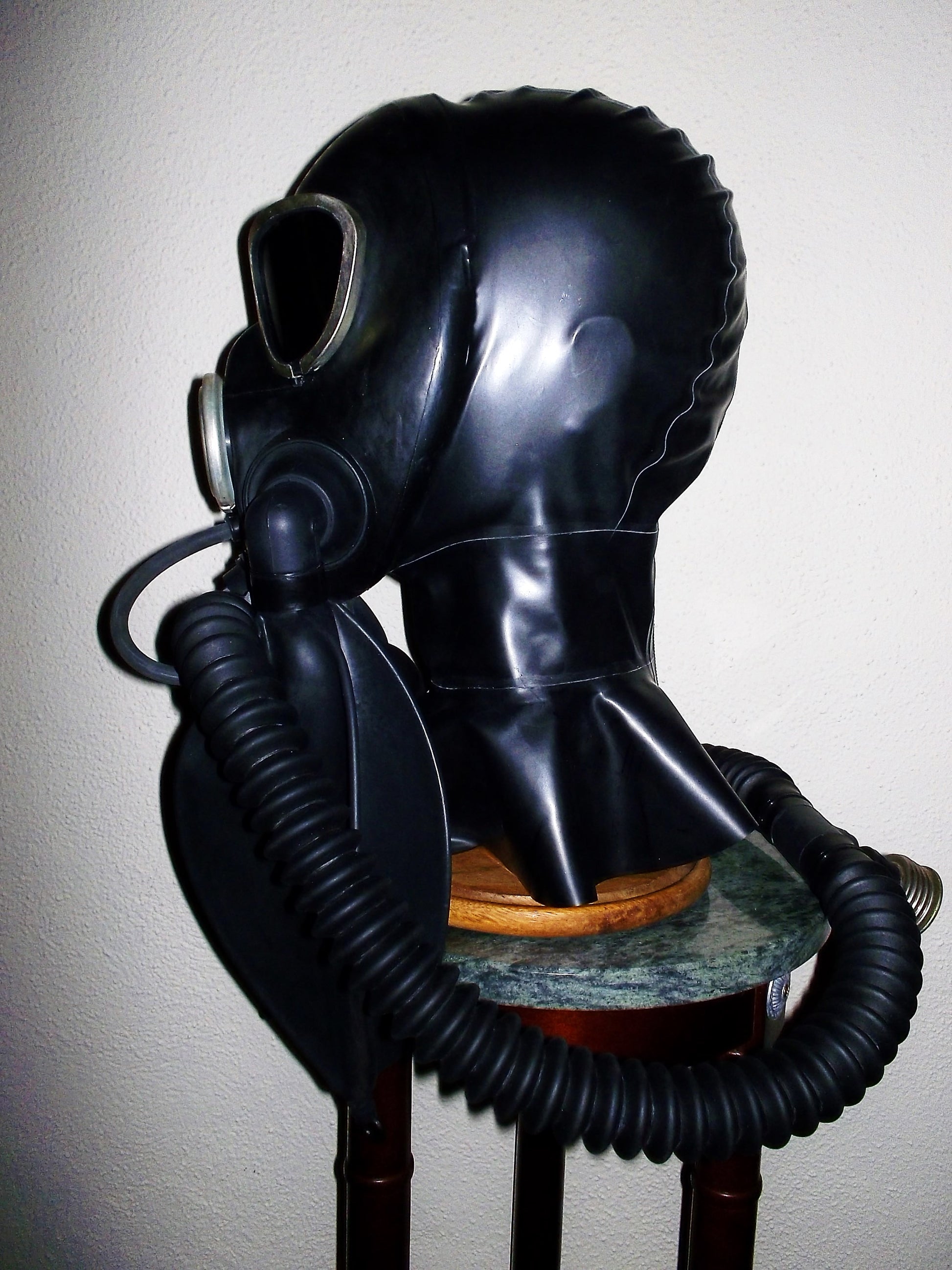 - HEAVY RUBBER BLACK GAS MASK with INTEGRATED silky smooth BLACK LATEX HOOD that COVERS WEARER'S HEAD, NECK AND DRAPES OVER THE SHOULDERS for comfortable fit and FULL ENCLOSURE (works great with rubber suits-no visible neckline!).