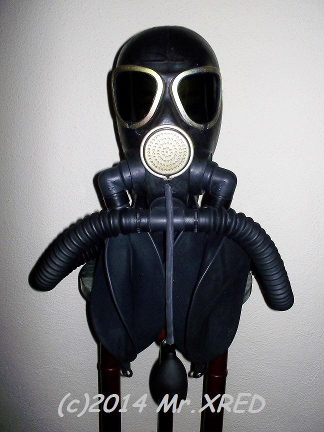 LATEX Hooded GAS MASK with Dark Tinted Lenses, Double Hoses, Inflatable Gag and Two Rebreather Bags HEAVY RUBBER by FANTOMAS & Co.